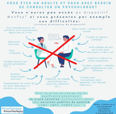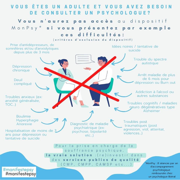 Il existe aussi le dispositif "Mon Psy" de la Sécurité Sociale qui est un beau projet dans l'idée, mais une réalisation insensée avec une dégradation du traitement professionnel des psychologues, et des patients également par la même occasion.